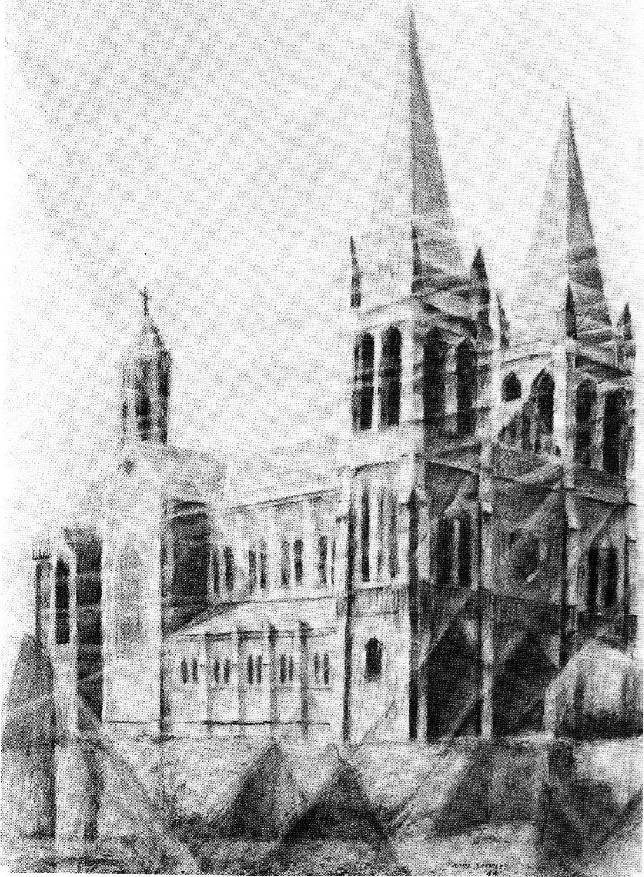 The only thing I heard in Art History that year were comments about how Monet’s paintings of Rouen Cathedral had pockets of geometric shapes of colour as shadows, and I decided to apply that in a larger way to our own St Peter’s cathedral.
