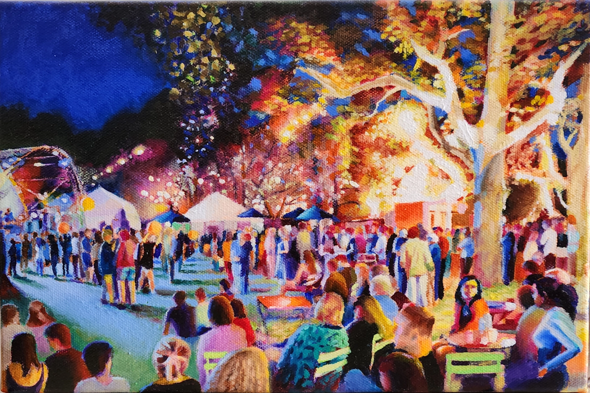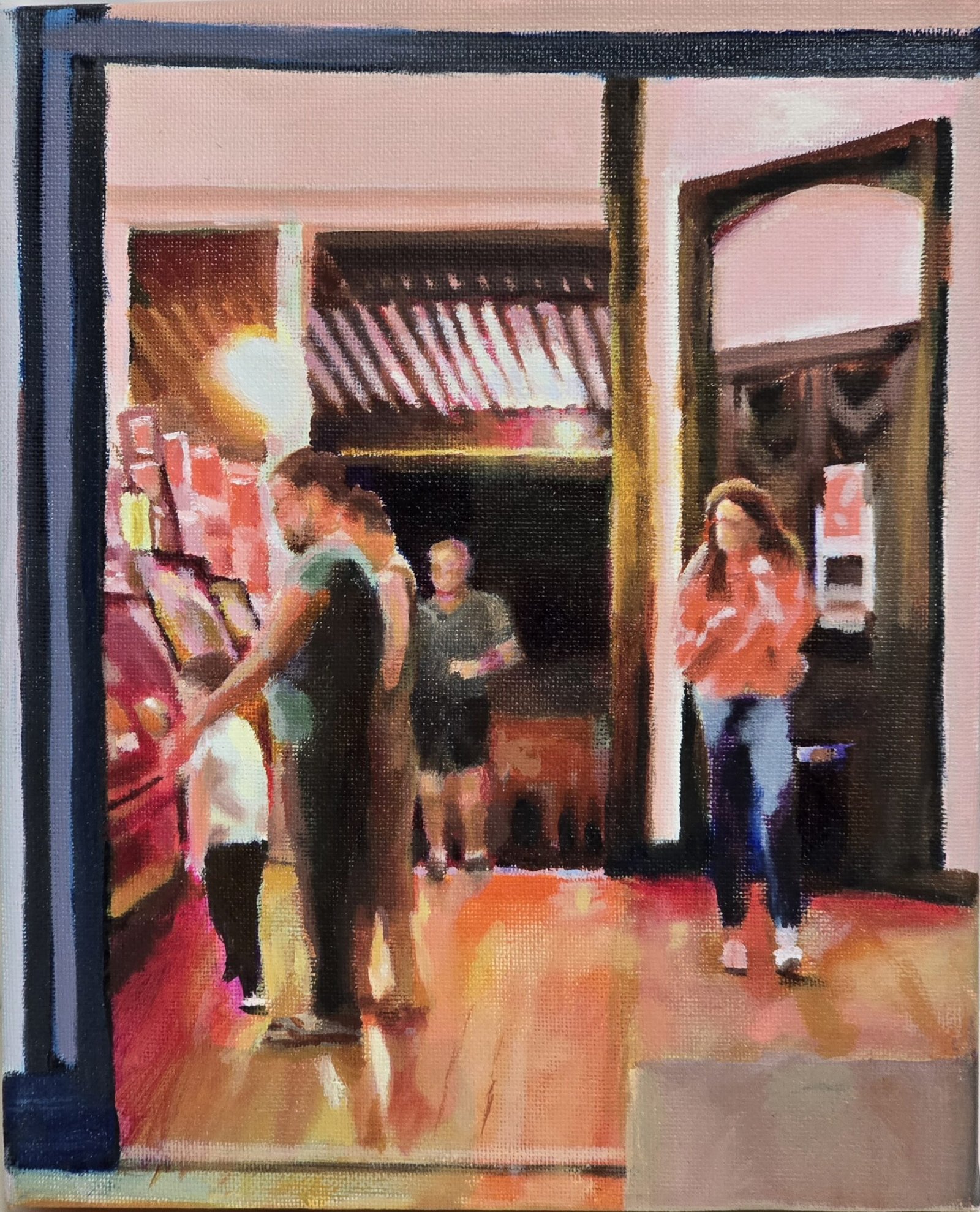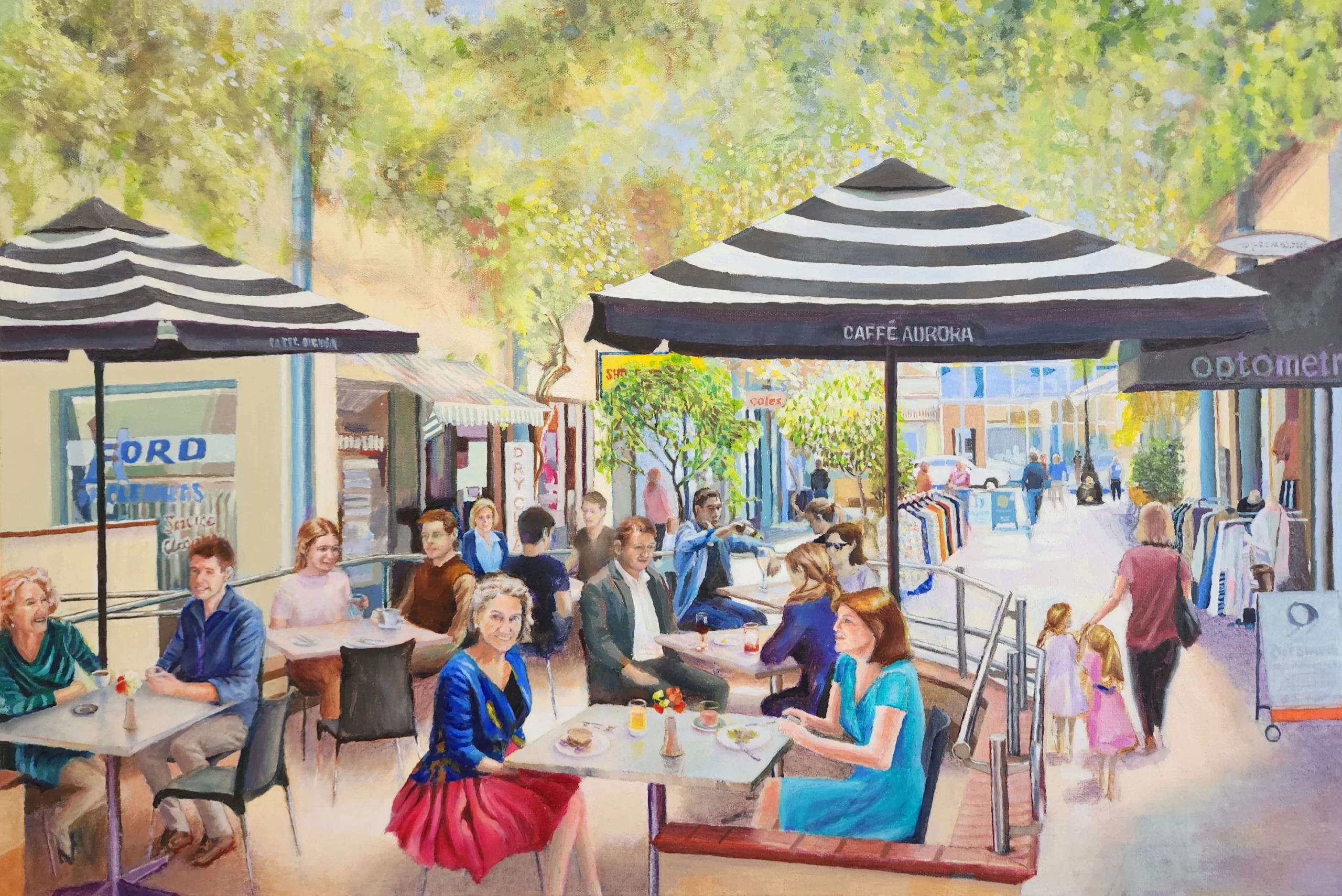 Paul (pouring champagne) and I used to often visit this outdoor cafe, and I took many photos. Shortly after I started the painting, the area was redeveloped, and this enjoyable site is now gone.